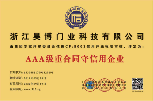 公司一直以來嚴(yán)格執(zhí)行ISO9001質(zhì)量體系和ISO14001環(huán)境管理體系標(biāo)準(zhǔn),建立了完備的科研、開發(fā)、生產(chǎn)、銷售服務(wù)體系。公司是浙江省門業(yè)協(xié)會會員單位,江山門業(yè)協(xié)會理事單位,中國木材與木制品流通協(xié)會會員單位,江山市消防協(xié)會副會長單位。
